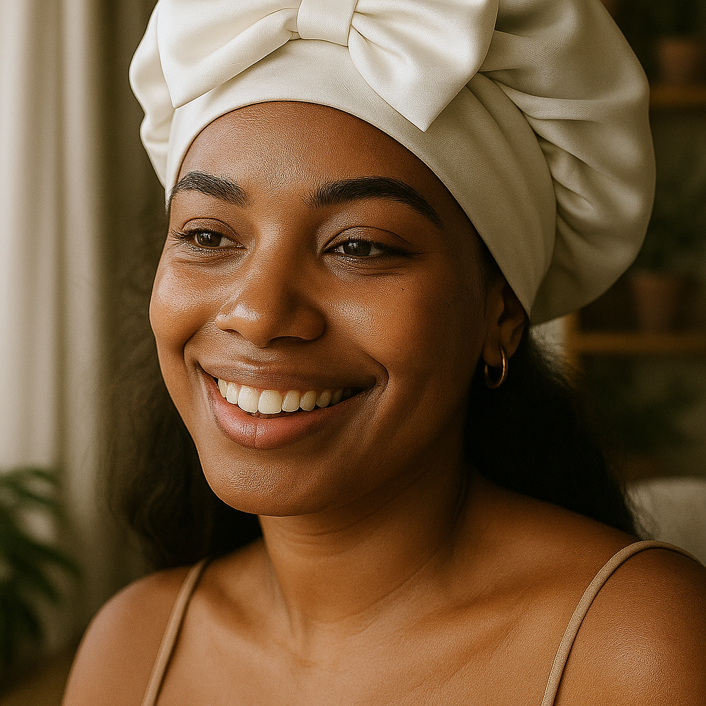"Côté cheveux, moins de friction, c'est moins de casse. La combinaison taie avec le bonnet et chouchous en soie CRYSTAAL préserve boucles et brushings et laisse la fibre plus lisse au réveil."